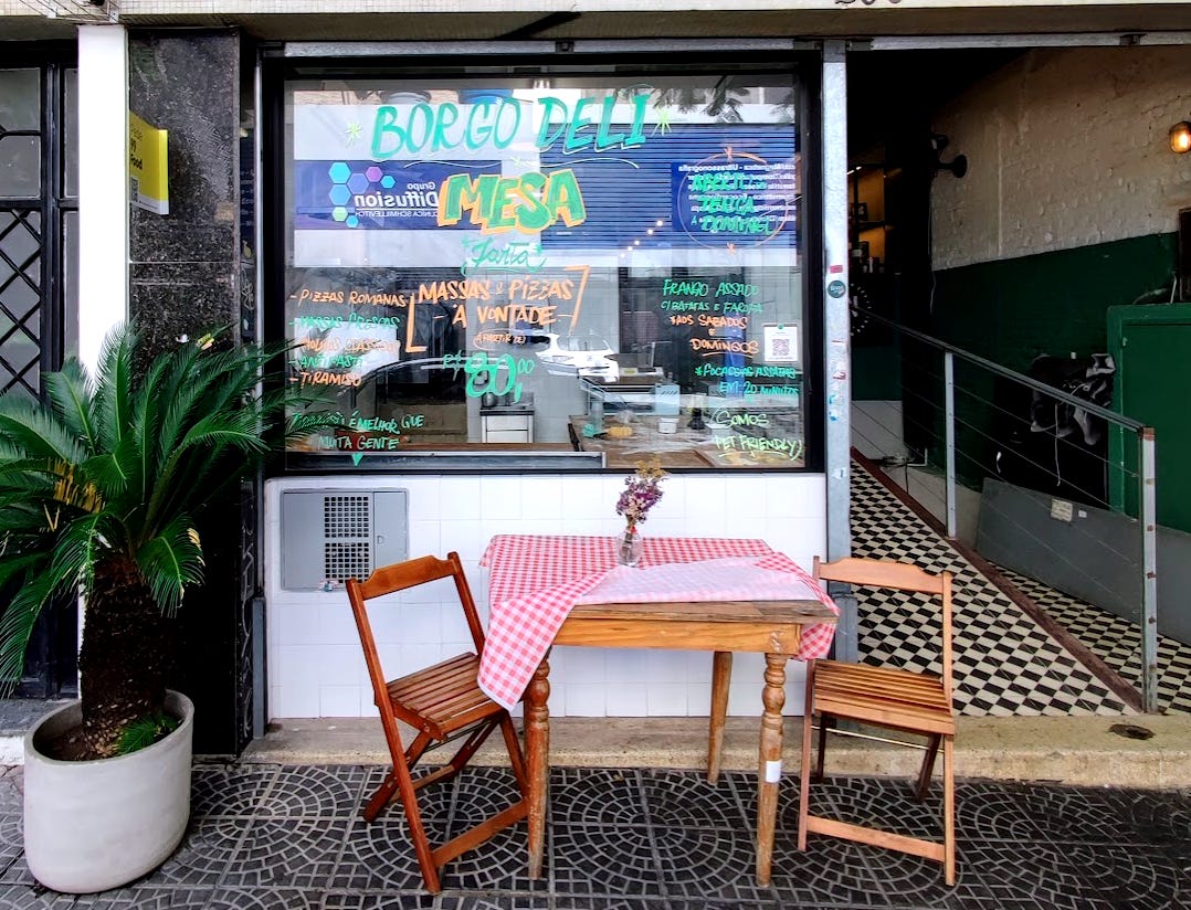 A âirmĂŁâ mais nova do Borgo Mooca Ă© uma deli, um espaço sem frescura para comprar e levar pra casa (ou comer ali mesmo, sem cerimĂŽnia). Tem a mesma vocação italiana da casa ao lado, sĂł que em formato rĂĄpido e de vitrine. Bom pra passar no almoço, resolver um jantar, levar algo para casa ou montar um piquenique de sofĂĄ: tem sanduĂches, pĂŁes, pizzas e uma seção de massas e pratos prontos que vocĂȘ sĂł precisa aquecer. A estrela Ă© o frango assado âde televisĂŁoâ, sempre suculento e bem temperado, funcionam especialmente bem com as lasanhas.