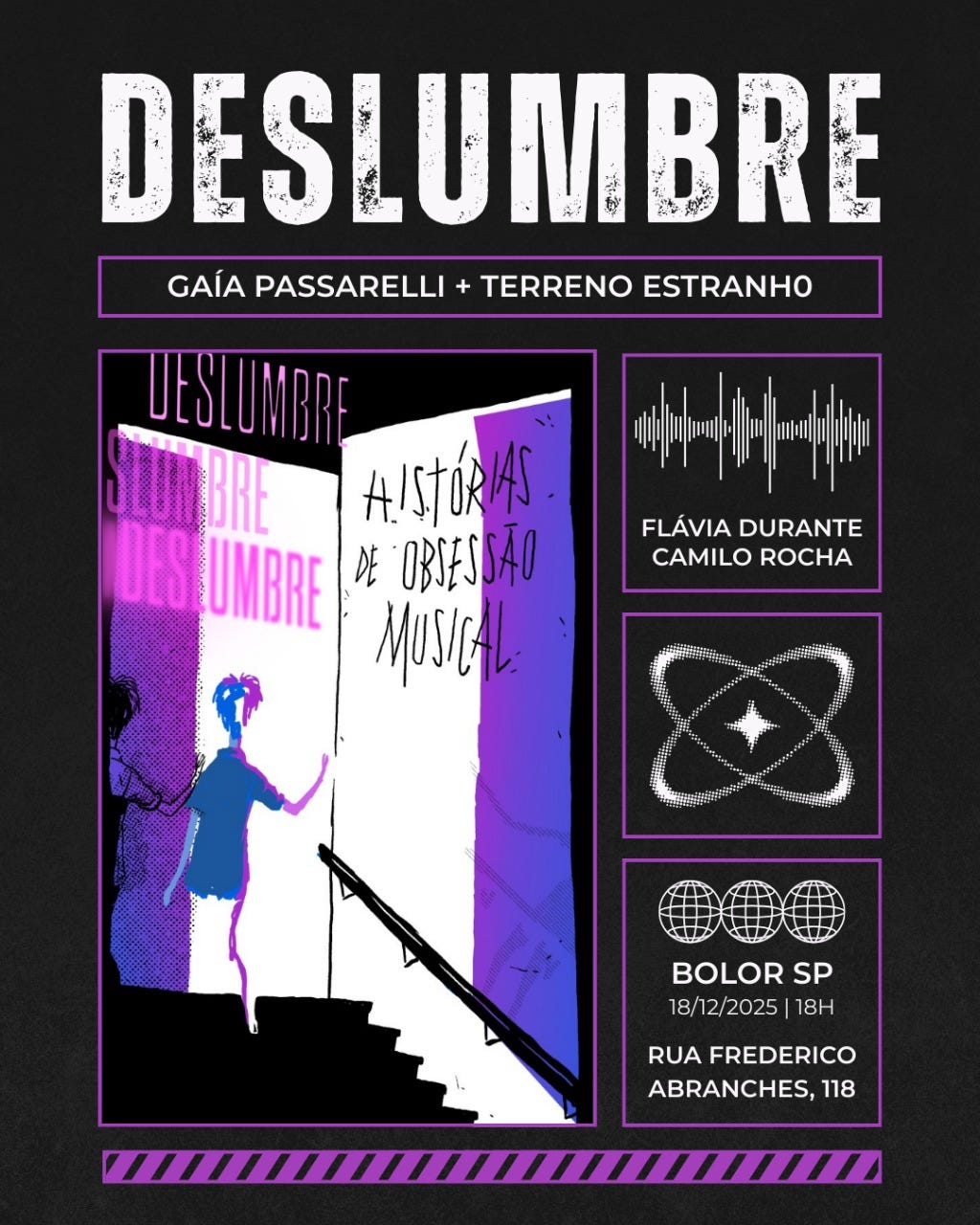 E tem ainda o lançamento do “Deslumbre”, meu livro novo, que está em pré-venda e tem lançamento oficial na próxima semana, com festa no ótimo Bolor, na Santa Cecília, com discotecagem da Flavia Durante e do Camilo Rocha. Quem já comprou na pré-venda (obrigada!) pode levar para assinar; quem não comprou pode resolver na hora. Também teremos pôsteres, adesivos e os outros livros do catálogo da Terreno, e o Bolor tem uma seleção ótima de vinis, camisetas e outras coisas bacanas.