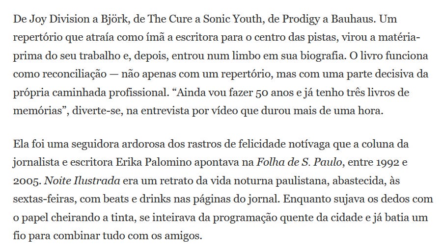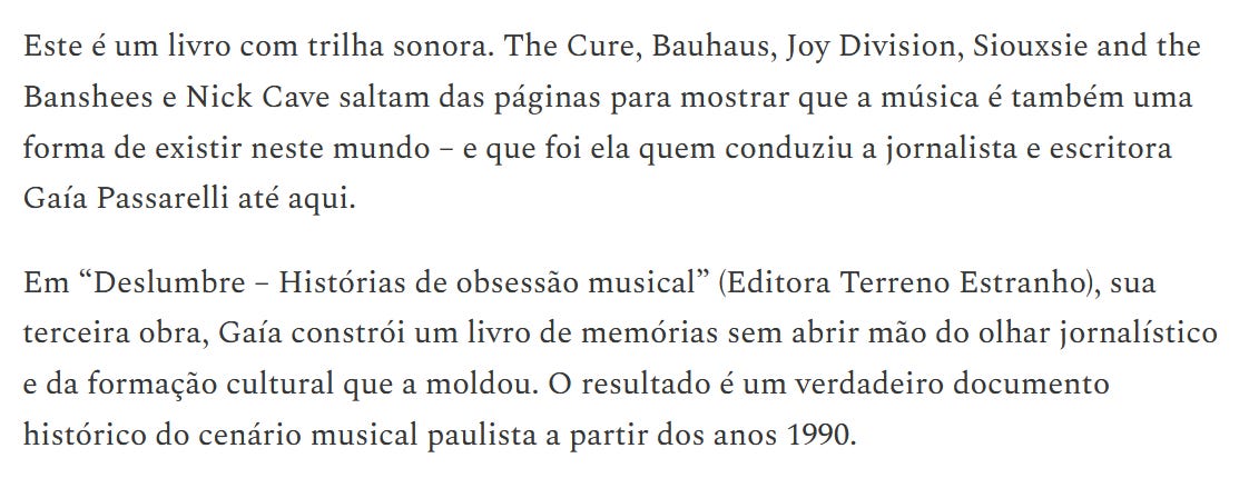 Na mídiaAparições recentes em espaços de comunicação sobre meus livros ou meu trabalho no Substack. Quer falar comigo? me mande um emailMessage Gaía PassarelliLeave a commentPublish News: Gaía Passarelli volta às pistas no livro ‘Deslumbre’, com suas memórias musicais | 27/02/2026Leia Mais Jornalistas: Jornalista traz documento histórico do cenário musical paulista a partir dos anos 1990 | 14/02/2026Metrópolis: entrevista com Renata Simões | 15/01/2026Mirada Janela: Deslumbre — Histórias de obsessão musical é um livro híbrido, situado entre a crônica autobiográfica, o memorialismo cultural e o jornalismo musical | 06/01/2026Leia Mais Jornalistas: Entre newsletters e narrativas: o espaço criativo do Substack | 21/01/2026Margem: 3 perguntas para Gaía Passarelli | 20/01/2026@margemcontentMargeM Content on Instagram: "3 Perguntas para: Gaía Passarelli…André Barcinski: novos livros musicais brasileiros| 12/01/2026Que Crise é Essa?, com Carla Lamarca e Lalai Persson(17/12/2025)Ismo: Gaía Passarelli volta à música e lança “Deslumbre” pela Terreno Estranho | 10/12/20265O Globo: A volta do ‘textão’: newsletters conquistam público saudoso dos blogs e cansado da ‘gritaria frenética’ das redes sociais | 25/03/2025saiba maisMessage Gaía Passarelli