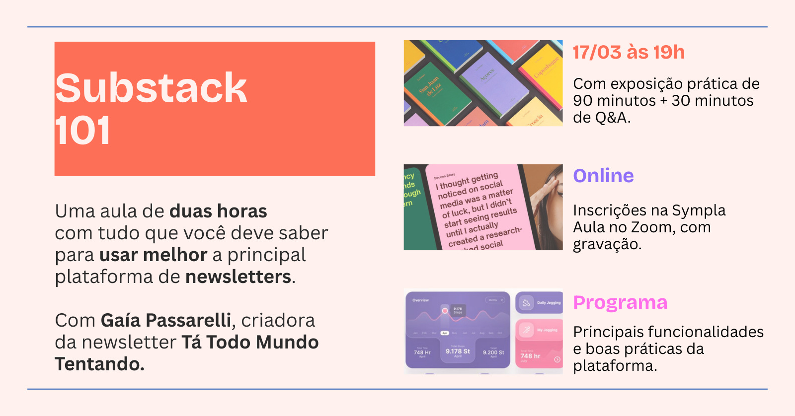 Antes de ir para as dicas: na próxima terça, 17/03, tem turma nova do meu Substack 101 — uma aula para quem quer começar (ou destravar) uma newsletter na plataforma, aprendendo como as coisas funcionam na plataforma.