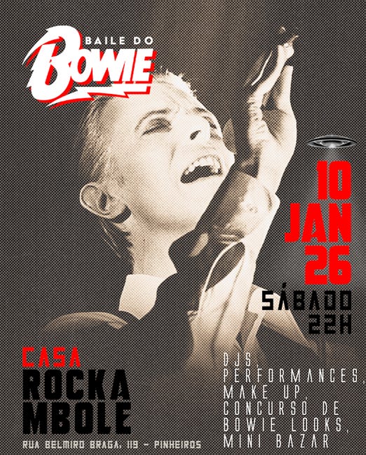 No sábado, 10/01, rola a edição 2026 do Baile do Bowie, na Casa Rockambole, que integra a agenda afetiva da comunidade bowieana da cidade desde 2015. A edição de 2026 marca três datas simbólicas: os 79 anos de Bowie, os 10 anos de sua morte e os 50 anos de “Station to Station”. São duas pistas (uma dedicada integralmente a Bowie), com DJs, performances ao vivo e competição de looks.